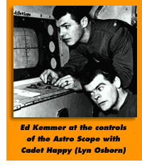 Unlike a lot of the movie heroes you've heard about, Ed Kemmer is the real deal. He distinguished himself in 47 missions as a World War II fighter pilot before being shot down and captured. He later escaped from the German prisoner of war camp that served as the inspiration for The Great Escape. In civilian life, he delivered his own daughter in the back seat of a police cruiser that didn't quite make it to the hospital in time. Who better to serve as one of TV's first heroic role models? At the start of the 1950s, television was poised to sweep the national imagination. A contagious creative spirit gripped the handful of writers, producers and actors drawn to the new medium. Emerging from TV's "anything goes" atmosphere were pioneering sci fi programs such as Captain Video, Rocky Jones and Space Cadet. Leading this spirited pack was Commander Buzz Corry of Space Patrol. Edward Kemmer, a struggling actor possessed of homegrown good looks and earnest demeanor, portrayed Buzz Corry, and is remembered fondly by fans of the show nearly 50 years later. "When I started the show I didn't even own a TV set," Kemmer laughs. "Someone did a survey that showed we had more adults watching than kids. Of course in those days of early TV most people would watch anything." It was future castmate Lyn Osborn who contacted Kemmer while he was working at the Pasadena Playhouse about auditioning for the part of Buzz Corry. Kemmer easily won over the show's producers. You might think that landing the part of the nation's leading space hero would bring him financial security, but as Commander Buzz Corry, star of a national television program, Kemmer pulled down a whopping $8.00 per show. Osborn, as Kemmer's comic sidekick, Happy, received the same. The remaining cast got $5.00. A raise was imminent after the show was picked up by ABC, but Kemmer and his castmates earned every penny of their salaries, memorizing wordy scripts and performing them live with a minimum of rehearsal. Ed leaves little doubt that live TV was no walk in the park. "You'd work with people who did a lot of stage and a lot of movies," he remembers. "They'd come and do Space Patrol, and they would walk off swearing and sweating saying, 'Never! Never again will I do a live show!' 'Well,' I'd always say, 'the first 500 shows are the toughest.'" When Buzz Corry touched down for the last time, Kemmer moved into motion picture acting. A quick study, he hustled through an entertaining array of programmers and horror movies including Giant From the Unknown and Earth vs. the Spider, as well as all of the major TV soap operas."I did 20 solid years of soaps, which were very good. But 20 years is enough." |